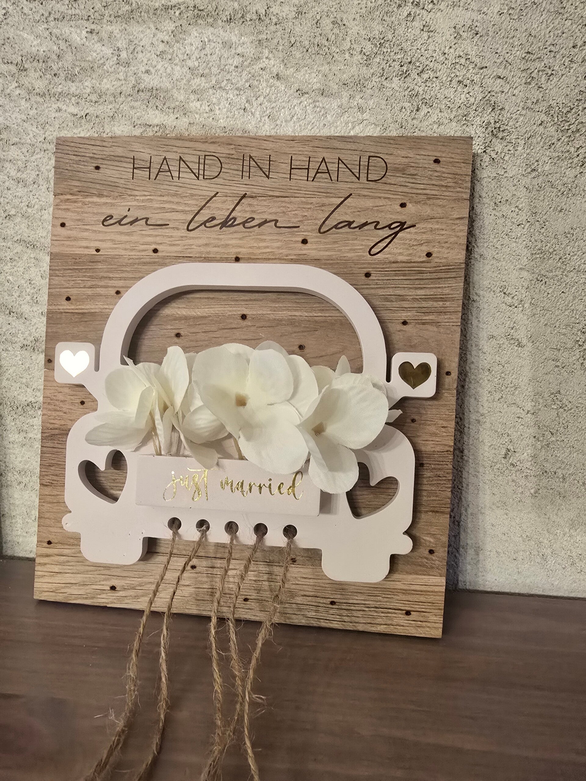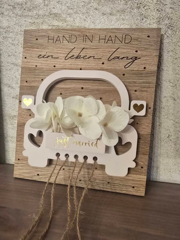 Das Auto wurde aus Raysin gegossen und mit künstlichen Blumen verziert. Den Text kann ich auf Wunsch gerne an eure persönlichen Wünsche anpassen.